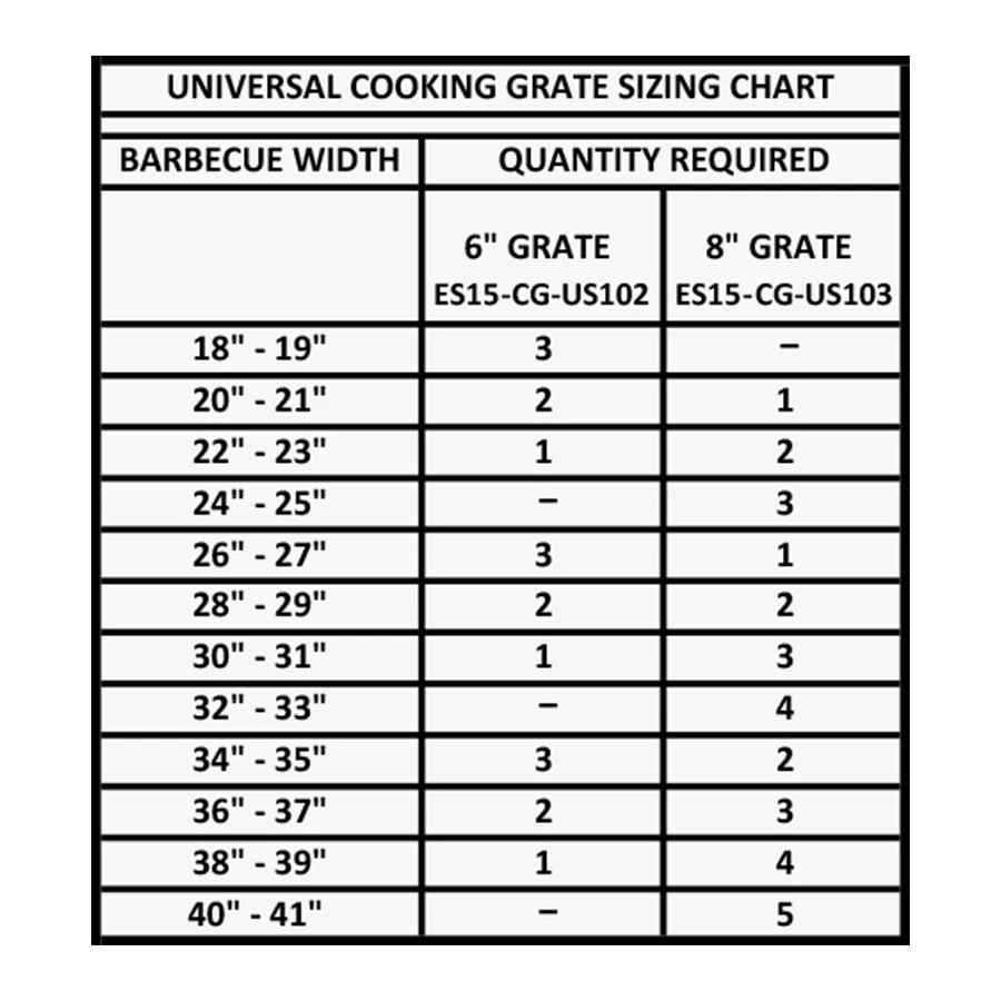 THIS PRODUCT IS TO BE USED IN CONJUNCTION WITH THE GRILLSPOT UNIVERSAL FIT 8″ ADJUSTABLE COOKING GRATE #ES15-CG-US103. PLEASE REFER TO THE SIZING CHART BELOW FOR REQUIRED QUANTITIES OF EACH PART.