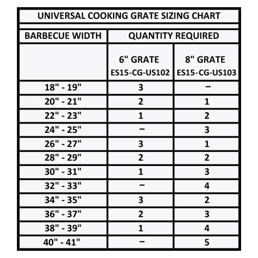 THIS PRODUCT IS TO BE USED IN CONJUNCTION WITH THE GRILLSPOT UNIVERSAL FIT 8″ ADJUSTABLE COOKING GRATE #ES15-CG-US102. PLEASE REFER TO THE SIZING CHART BELOW FOR REQUIRED QUANTITIES OF EACH PART.